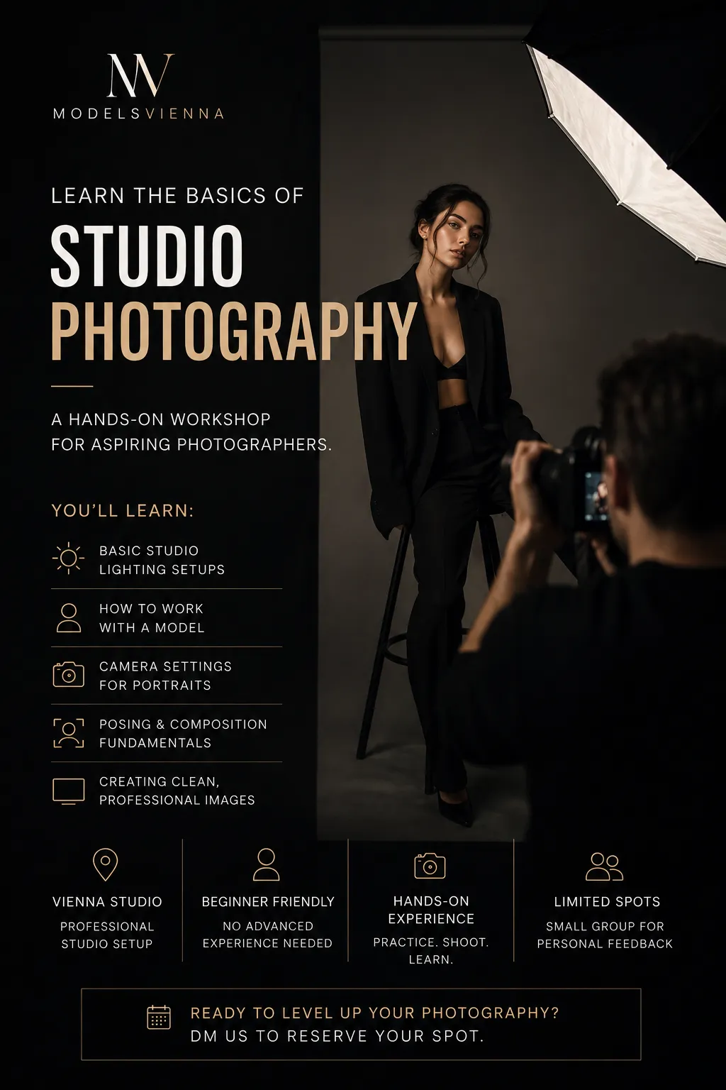 Learn the Basics of Studio Photography 📸 Step into the studio and discover how professional portraits are created. This beginner-friendly workshop is designed for anyone who wants to understand lighting, posing, camera settings, and studio workflow. ✨ What you’ll learn: • Basic studio lighting setups • How to work with a model • Camera settings for portraits • Posing & composition fundamentals • Creating clean, professional images No advanced experience needed — just curiosity and creativity. 📍 Vienna Studio 🎓 Beginner Friendly 📸 Hands-on Experience Limited spots available